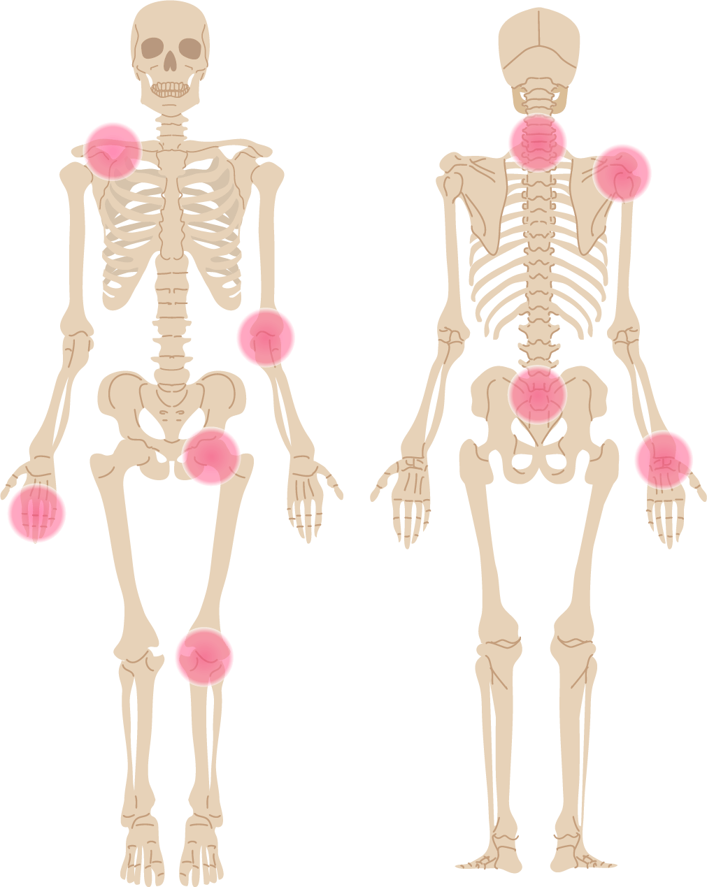 膝・股関節の痛みは、多くは軟骨のすり減りからくる変形性関節症です。これらは体重を支える関節ですので、その痛みは立つこと歩くこと全てに障害をきたし、日常生活の支障が大きくなります。膝関節にはスポーツ障害に多い前十字靭帯や内側側副靭帯などの靭帯損傷、半月板損傷などもあります。股関節では骨頭壊死や関節唇損傷などがあります。これらの診断にはレントゲンやMRIなどが重要です。治療法としては膝の軟骨成分であるヒアルロン酸の関節内注射や、関節の緊張をほぐす温熱療法、筋肉の低下を防ぐ運動療法などを行います。また、関節の負担を減らすためには体重のコントロールも重要です。